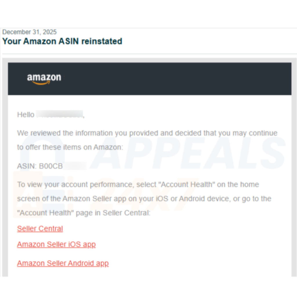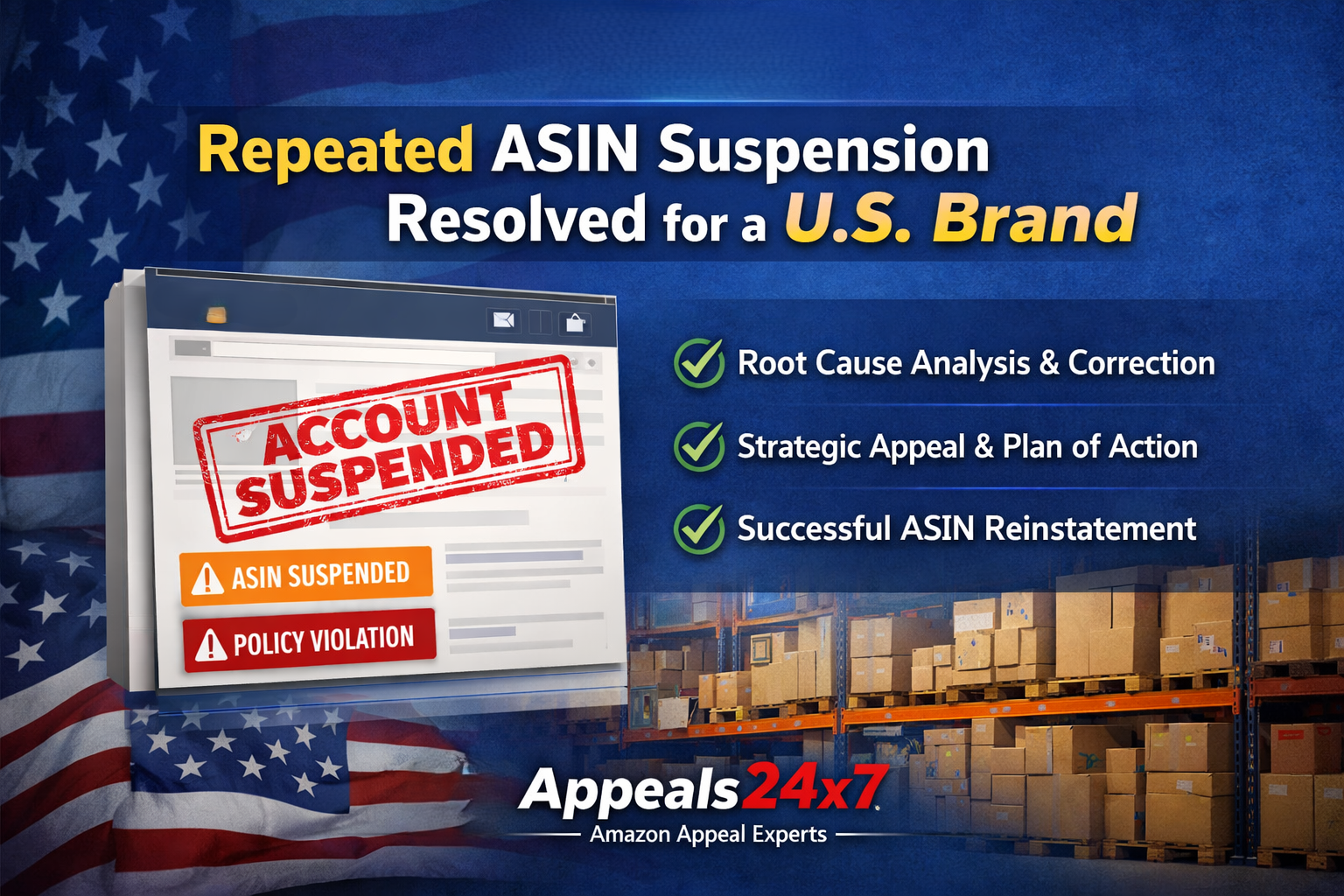 This Amazon ASIN reinstatement case study USA explains how Appeals24x7 successfully reinstated a repeatedly suspended ASIN for a U.S. based brand seller after multiple failed appeal attempts, restoring long-term listing stability and protecting the seller’s account health.